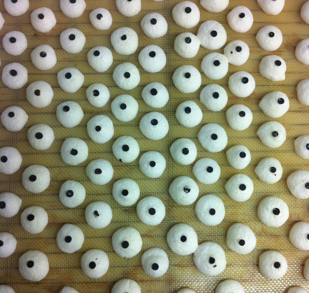 Eyes of merengue with a licorice root pupil for the zombie dessert at A Fuego Negro